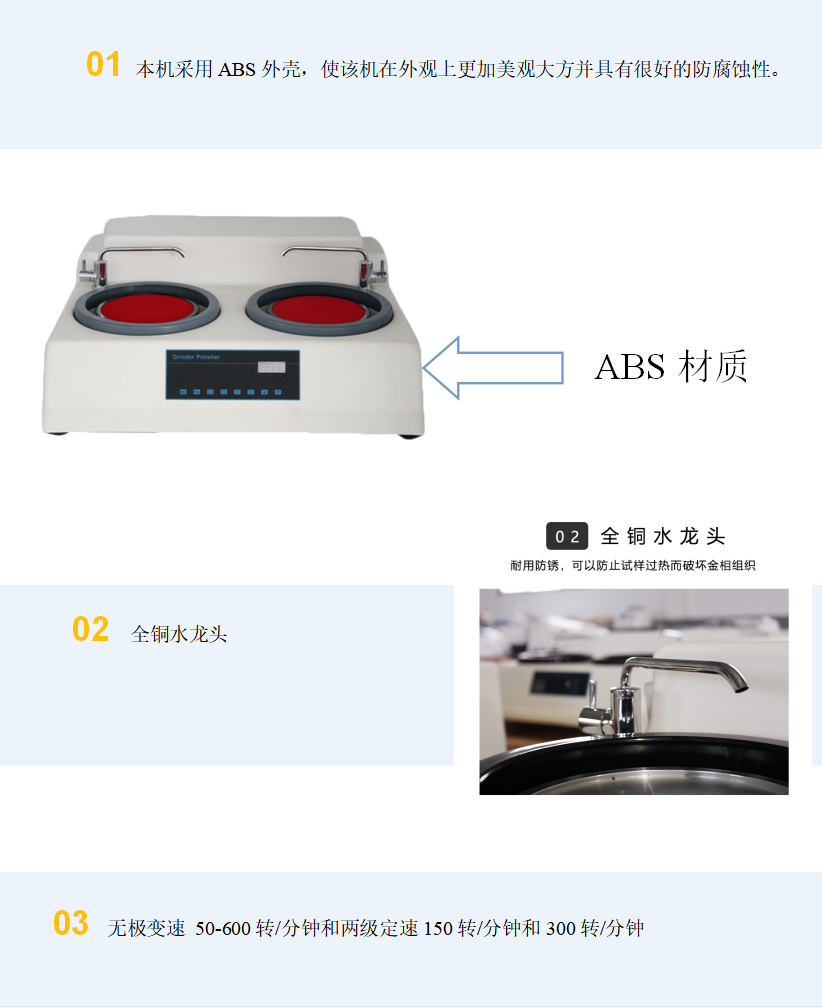 本機(jī)帶有冷卻裝置,可以在研磨拋光時(shí)對(duì)試樣進(jìn)行冷卻,以防止因試樣過熱而破壞金相組織。該機(jī)使用方便、安全可靠,是工廠、科研單位以及大專院校實(shí)驗(yàn)室的理想制樣設(shè)備。